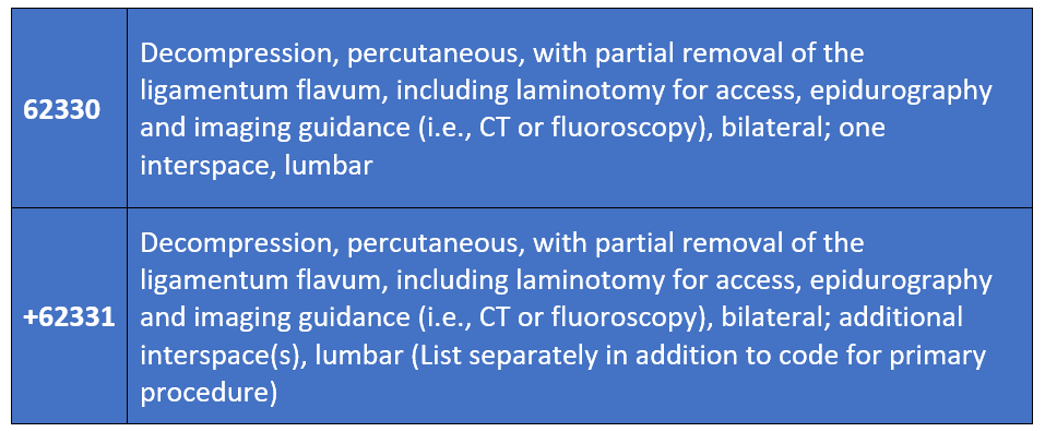 Chronic pain practitioners will have two new codes available in 2026. These will replace the deleted code 0275T for the MILD procedure. Below are the new codes, along with their descriptors.