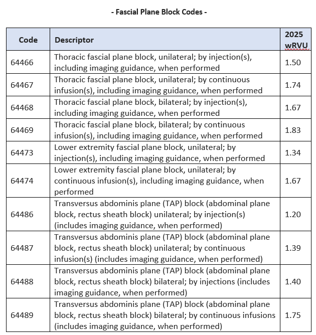 According to the American Society of Anesthesiologists (ASA), CMS finalized the values of several Facial Plane Block codes, which the ASA hails as “a significant win for anesthesiologists and pain medicine physicians.” Starting January 1, 2025, pain medicine physicians—as well as anesthesia providers—will be able to get paid by Medicare for providing thoracic (64466, 64467, 64468, 64469) and lower extremity (64473, 64474) fascial plane block services reported with these new Category I CPT codes. These new thoracic and lower extremity fascial plane block services expand on the existing transversus abdominis plane (TAP) block code family (64486 – 64489). For 2025, CMS finalized the following work RVUs for the fascial plane block codes. The table below reflects CMS’s proposed work RVUs for the fascial plane block codes.