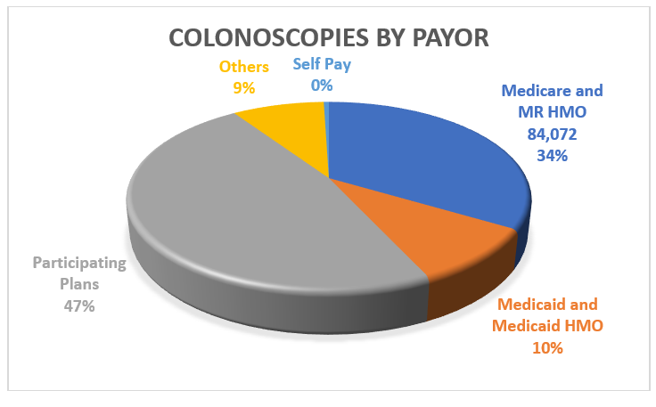 A review of five years of data for colonoscopies from ten large Coronis Health clients indicates the basic trends of this part of the business. The majority of patients have commercial insurance, which pays well. Medicare patients represent about a third of all cases at discounted Medicate rates. Self-pay patients with no insurance are a very small piece of the overall pie.