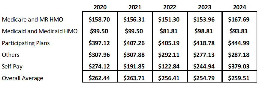 As is often the case, Medicare and Medicaid rates have a significant impact on the overall net yield per case. Payer mix is always determinative in the calculation of the profitability of the service. As indicated below, the overall average yield per case is approximately $260. Clearly, the efficiency of the venue and the average number of cases performed per day are the most critical factors in determining profitability. Given the short duration of colonoscopies, if scheduled effectively, the revenue generated per hour is high, which could make this a particularly profitable service line.