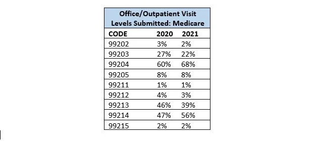 Recently, Medicare released data showing percentages for the submission of each E/M code level for the office or outpatient setting. Such data is typically provided on a two-year retrospective basis; thus, the results released at the end of 2023 reflect claims that were submitted back in 2021—which marks the first year for the shift in E/M code level calculation.