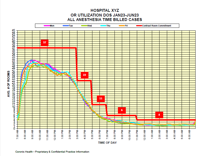 The focus of a successful anesthesia practice should be on developing meaningful productivity measures and tracking them over time. The chart below is a typical example of room utilization at a community hospital that this client shares with administration on a monthly basis. It allows the practice to clearly identify and review staffing requirements.