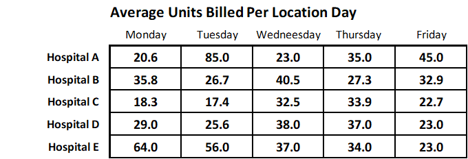 The table below shows activity from five hospitals. Each hospital ran at least 10 operating rooms per day when they were busy. The data reflects actual activity for the month of August 2023. It clearly demonstrates the variations from practice to practice and day to day. Days with an especially high value probably reflect cardiovascular cases. It may be useful to remember that a practice should generate at least 50 ASA units per eight-hour anesthetizing site that is paid at a reasonable rate per unit to cover the cost of the care.
