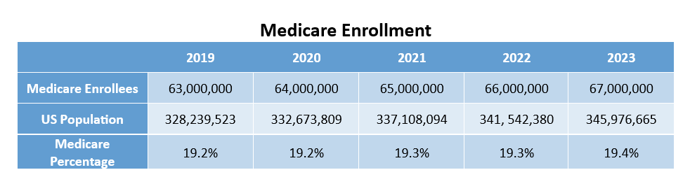 As indicated below, the Medicare population has grown significantly over the past five years and currently represents about 19.5 percent of all Americans. At least one million new subscribers or 1.5 percent are added each year. While it is true that the most common conditions affecting older adults are non-surgical chronic conditions like diabetes, obesity and hypertension, many Medicare patients do require surgery. The average Coronis client group typically experiences about a one-percent increase in its Medicare population per year, although this varies based on the location of the practice.