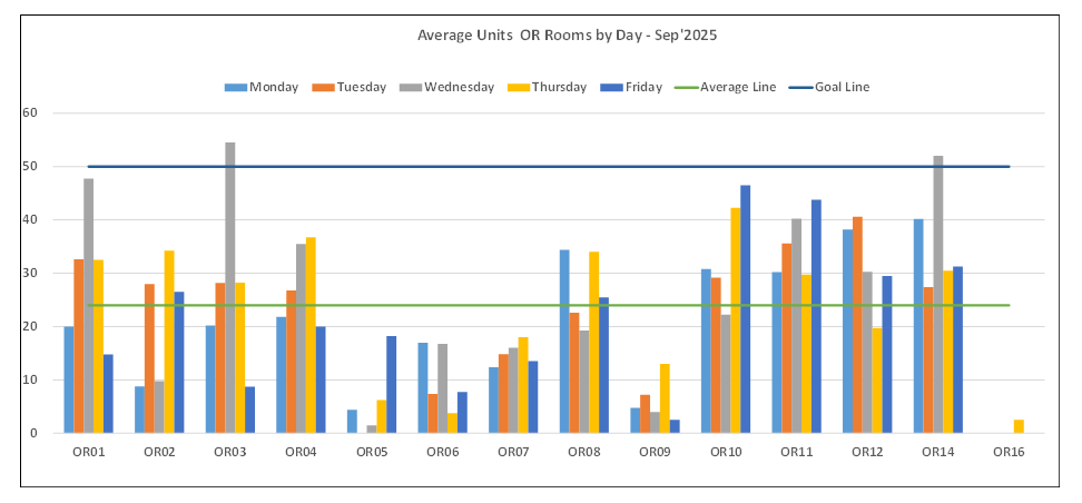 Normalized metrics reflect the average value per clinical day. In this example, if the target is 50 ASA units per day, then it is easy to identify that the room is underutilized. Typically, such calculations will only include weekdays, prime-time data and exclude after-hours and holidays. Usually, obstetric activity is not included in such calculations; however, this same methodology can be carried out for the step-down rooms to help determine efficiency levels later in the day. It should be noted that, even with optimal efficiency, support in the current market is necessary due to compensation levels. Furthermore, payer mix associated with billed units also plays a vital role in the potential shortfall of staffing any OR.