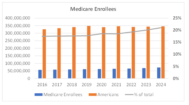 The most significant factor affecting the cost of healthcare in the U.S. is demographic trends. The American population is aging as baby boomers become Medicare recipients. The fastest growing segment of our population is the over-80 crowd. As the chart below clearly indicates, the percentage of Americans enrolled in Medicare has already reached 20 percent and is consistently growing.